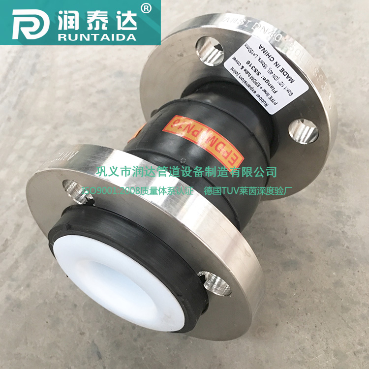 襯四氟橡膠接頭具有減振、耐高溫、能撓曲、耐摩擦等特點。適用于管道錯位差、位移、尺寸變化及振動部位的連接??勺髻A罐、槽車等設備的給、排料管,還可作其它特殊之用。其使用范圍較廣泛,作用較全面。襯氟橡膠接頭的四氟具有優良的化學穩定性、耐腐蝕性,是當今世界上耐腐蝕性能材料之一,除熔融和液氟外,能耐其它一切化學,在旺水中煮沸也不起變化,廣泛應用于各種需要抗酸堿和有機溶劑的。密封性,高潤滑不粘性、電絕緣性和良好的抗老化耐力、耐溫優異(能在+250℃至-180℃的溫度下長期工作)。襯氟橡膠接頭適用于各種介質的管道連接。
